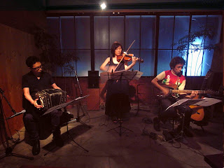 さて、お客さまのひざにくっつくかという近さのステージに三人横並びになってのライブ。